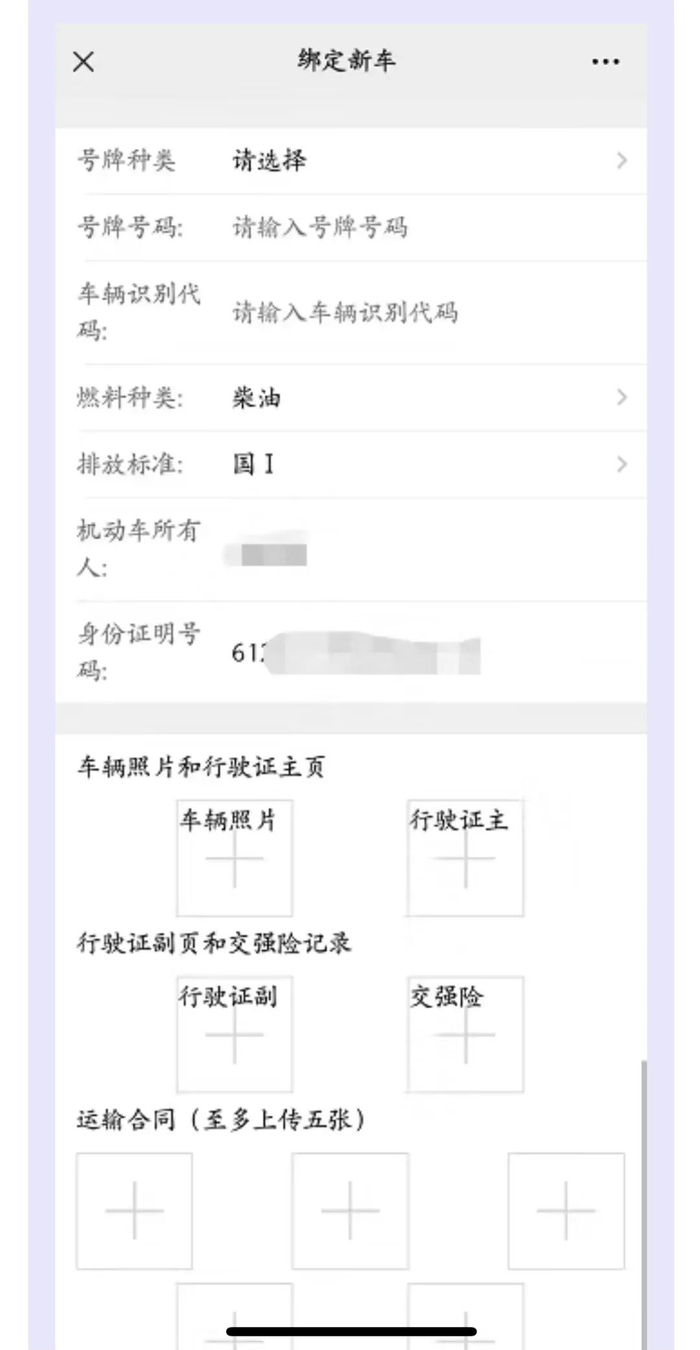 在系统中点击“车辆绑定”,选择号牌种类、填写车牌号码、车辆识别代号、燃料种类、排放标准并上传车辆照片、行驶证主副页、交强险记录和运输合同,并保证信息真实准确、且证件资料均在有效期内,点击保存系统核查车辆信息,核查通过绑定成功。