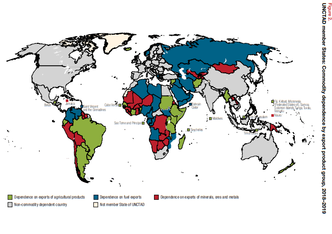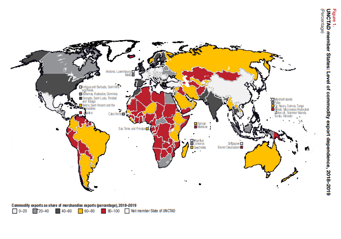UNCTAD在报告中发现,2008~2009年依赖大宗商品的大多数国家和地区,在2018~2019年仍然如此。同时,值得注意的是,大宗商品依赖现象通常发生在发展中国家和地区:根据UNCTAD的统计,在2018~2019年期间被视为依赖大宗商品出口的101个国家和地区中,有87个是发展中国家。此外,在这101个国家和地区中,有38个国家和地区依赖农产品出口,32个国家和地区依赖矿业出口以及31个国家和地区依赖燃料出口。