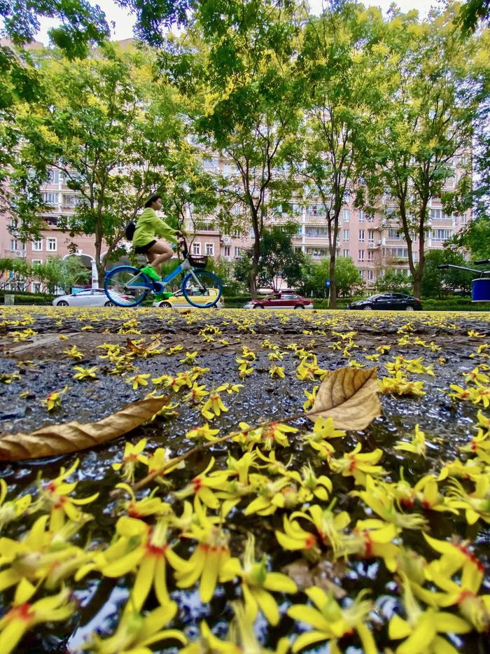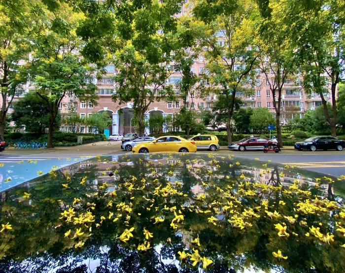 而在街头,这几天很多马路上落满了小黄花,不细看还以为秋桂满地。其实,这是栾树开了花。而当黄花还未落尽时,栾树的红色蒴果也会挂上枝头,预示着秋天的到来,成为魔都夏末秋初最靓丽的风景线。