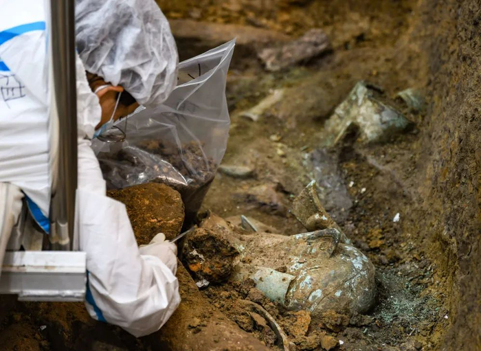 ↑在四川德阳广汉市三星堆遗址,考古人员在8号“祭祀坑”内工作(9月2日摄)。