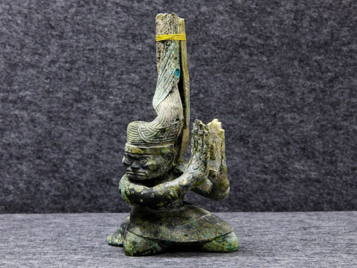 ↑这是在四川省文物考古研究院三星堆考古研究所拍摄的三星堆遗址4号“祭祀坑”出土的铜扭头跪坐人像(9月3日摄)。