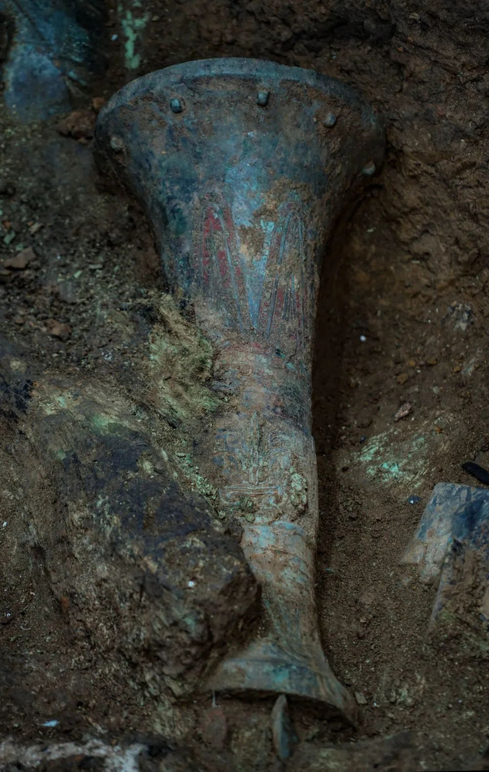 ↑这是在四川德阳广汉市三星堆遗址考古发掘现场8号“祭祀坑”拍摄的朱砂彩绘觚形尊(9月2日摄)。