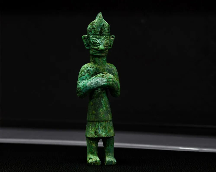 ↑这是在四川省文物考古研究院三星堆考古研究所拍摄的三星堆遗址3号“祭祀坑”出土的铜顶尊跪坐人像(9月2日摄)。