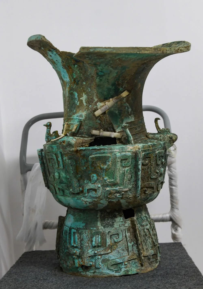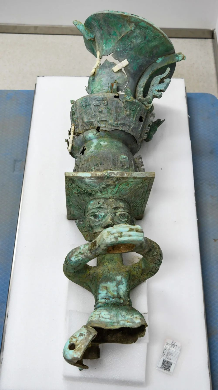 ↑这是在四川省文物考古研究院三星堆考古研究所拍摄的三星堆遗址3号“祭祀坑”出土的铜尊(9月2日摄)。