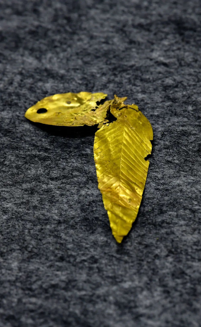 ↑这是在四川省文物考古研究院三星堆考古研究所拍摄的三星堆遗址8号“祭祀坑”出土的金树叶(9月3日摄)。