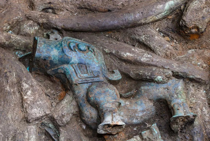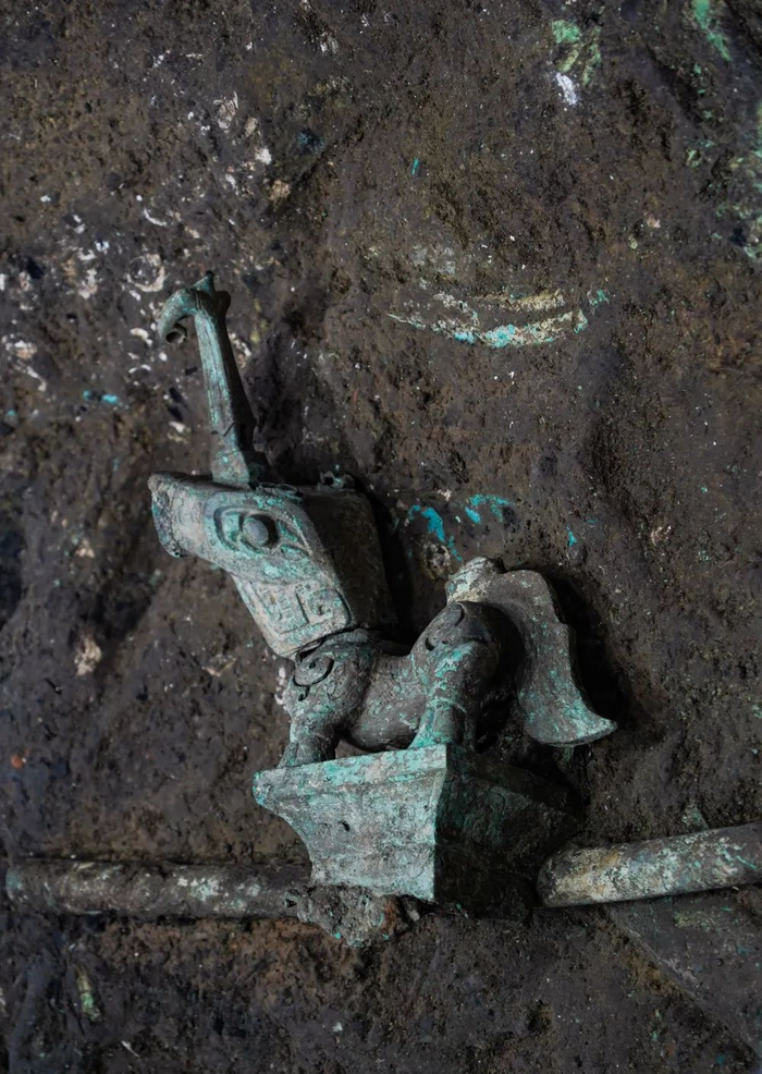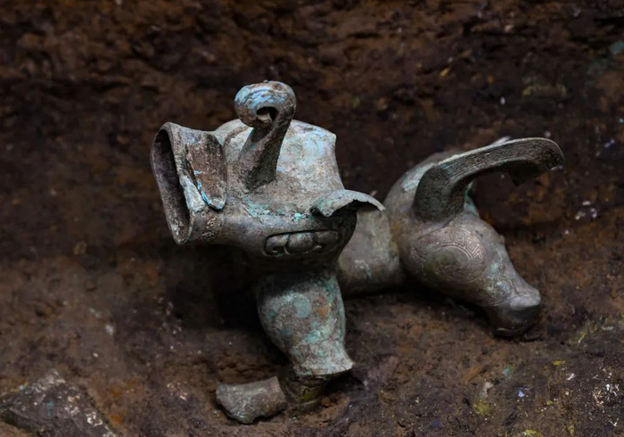 ↑这是在四川德阳广汉市三星堆遗址考古发掘现场3号“祭祀坑”内拍摄的青铜神兽(9月6日摄)。