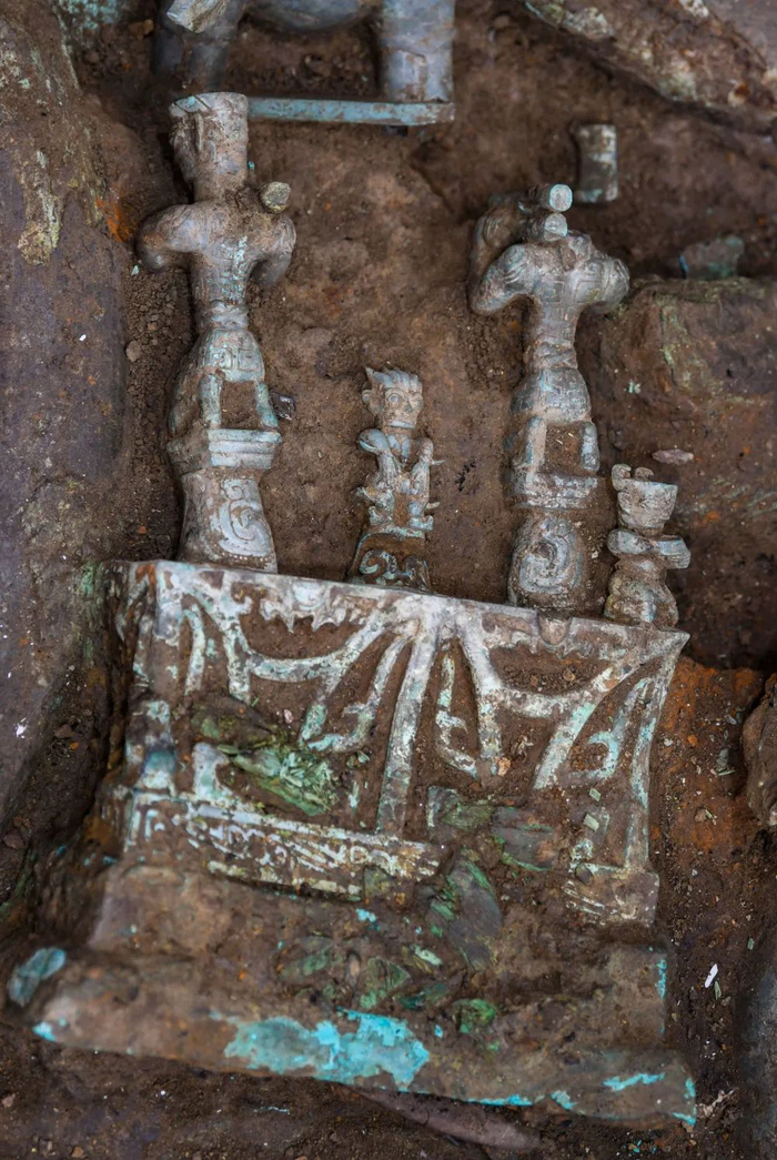 ↑这是在四川德阳广汉市三星堆遗址考古发掘现场8号“祭祀坑”拍摄的青铜“神坛”局部(9月2日摄)。
