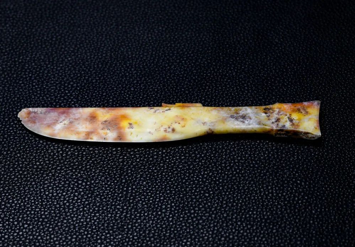 ↑这是在四川省文物考古研究院三星堆考古研究所拍摄的三星堆遗址6号“祭祀坑”出土的玉刀(9月3日摄)。