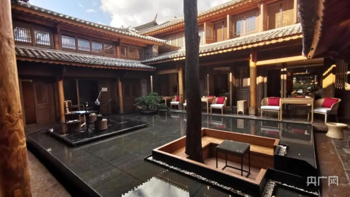 一进门的“冬”院,幽幽篁竹,勾勒出迎宾小径的轮廓;移步换景转至“夏”院,古木黑松与一汪浅潭照映出巍山的蓝天,瞬间令人平静下来;“春”院中有满目的青翠和枯山水般的石路青苔,让人幻想春天樱花绽满;最后的“秋”院是整个酒店最深处的一个院落,院子里有一颗高大的柿子树,待到秋天便是硕果满枝头。