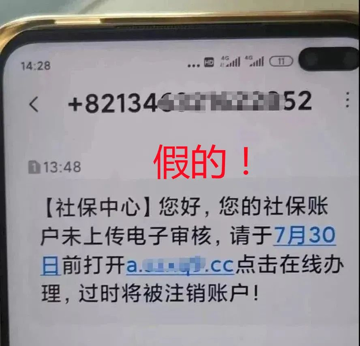据晋江公安最新通报,8月3日,晋江安海西垵村一男子收到自称是“社保中心”的短信,称其社保账户未上传电子审核需要点击链接(p.XXXX.cc)在线办理,过时将被注销账户。该男子按要求填写个人信息、银行卡号验证码后发现被骗9999元。