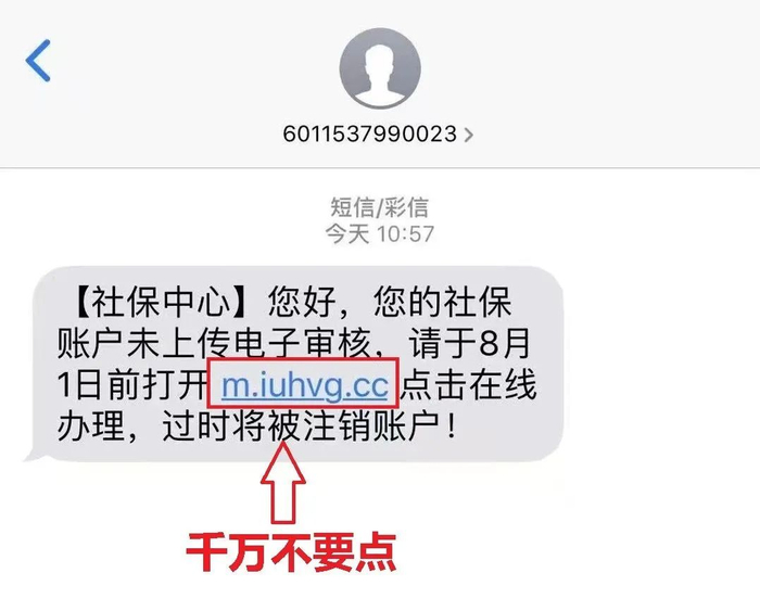 利用短信自称为社保中心,通知参保人“您好,您的社保账户未上传电子审核,请于XX月XX日前打开xxxxxxx点击在线办理,过时将被注销账户”。