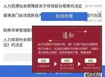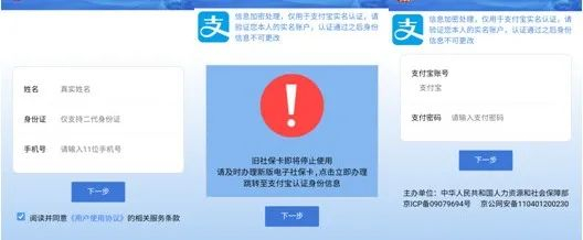他点击上述网站“在线办理”飘窗,并按照页面提示,一步步登录、填写个人信息、身份证号、手机号后,系统提示需要及时办理新版电子社保卡,并需要进行“支付宝认证身份信息”。