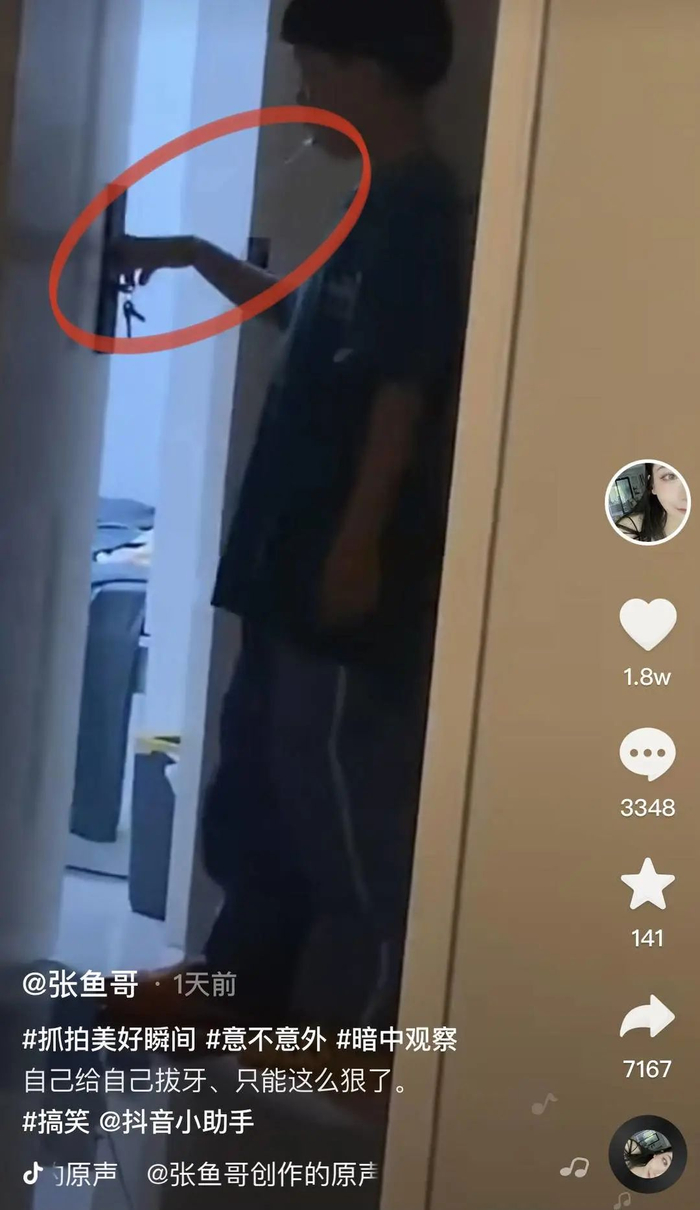 视频中,男孩用棉线绑在门上为自己拔牙。