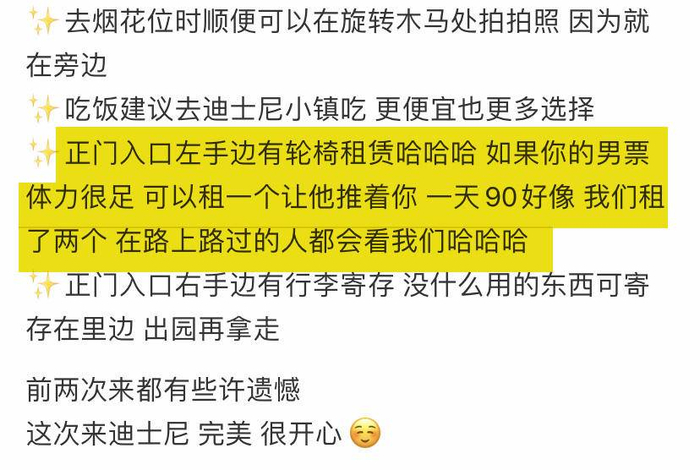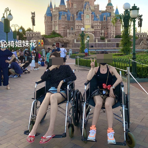 记者在某社交平台看到,不少网友在发布的上海迪士尼游园攻略中提到,租借轮椅可让游玩更省劲。有一位女生在文中写道,“正门入口左手边有轮椅租赁,如果你的男朋友体力很足,可以租一个推着你走,我们租了两个,路过的人都会看我们。”这个姑娘和她的朋友坐在轮椅上,在园区内多个景点处留下合影。有人留言表示很羡慕,也有不少人想效仿,问这位女生怎么借轮椅,甚至有人在文章下面艾特自己的男朋友。