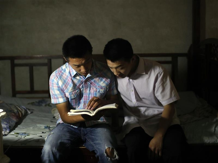 △金华栋(左)与弟弟金华梁在看书交流孩子们即将开学