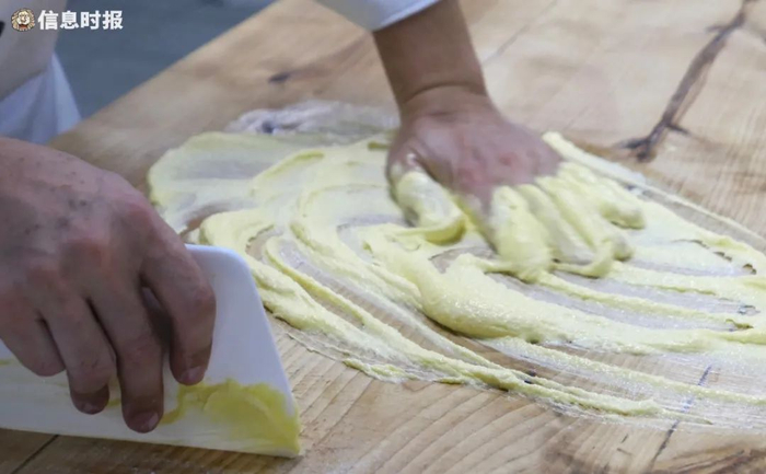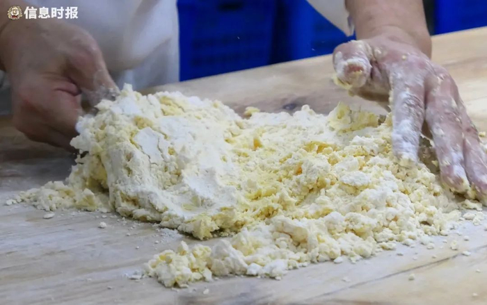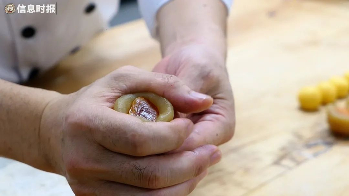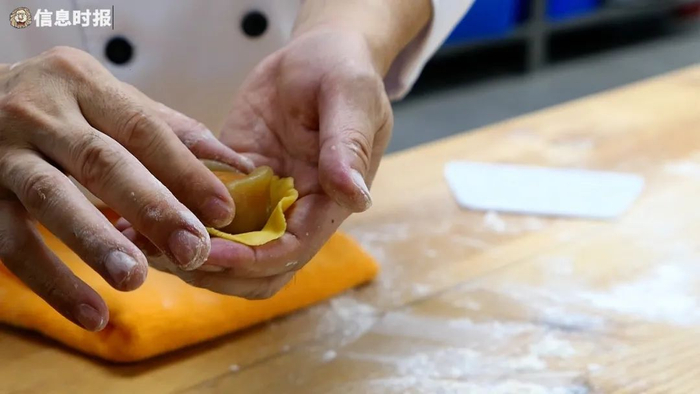 若说迷你月饼面世之初是“无心”之作,那么它能红足30多年,则不能不看到其中的用心。走进点心部后厨,月饼的香气扑鼻而来。月饼皮要做到酥而不破,对师傅揉面的技巧有讲究。“叠”与“捞”需交替进行,一边和面一边慢慢“入蛋”,直至将面团揉至有“浮身”的空气感。