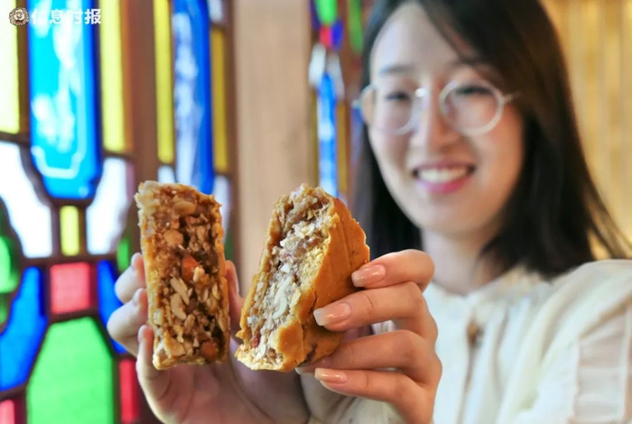 以白芝麻、核桃、瓜子、榄仁、杏仁等五种果仁为馅料的五仁月饼,口感之坚硬在下刀分切月饼时就能感受得到。果仁属于“瘦物”,为了丰润其口感,传统五仁月饼中必须加入以料酒冰糖腌制而成的冰肉。为了提升其口感,广州酒家新出的大师五仁月饼以金华火腿入馔,多了几分咸香味,少了几分油腻感。品着茶香吃五仁月饼,确实如周伯所说的,越吃越甘香。