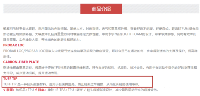 产品介绍显示,其使用了一种名为“TUFF TIP”的鞋头耐磨材料,应用于鞋面脚趾处,宣称可以防止鞋面过早磨损,从而延长鞋的使用寿命。这款鞋官网售价为1099元。