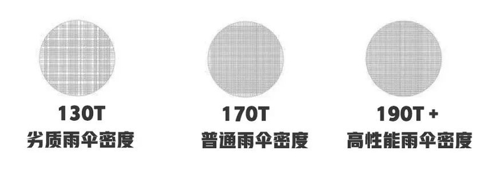 平时我们买的雨伞,密度一般是170T、190T,偶尔也有达到200T的。(密度越大,雨伞越不会被浸湿)