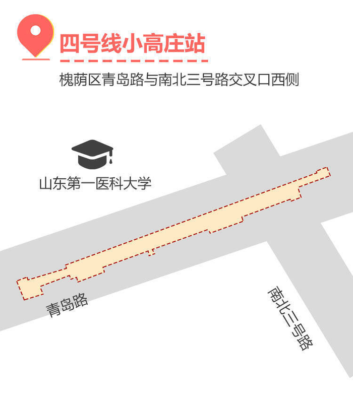 4号线一期此次自西向东共公布了小高庄站、青岛路站、腊山站、奥体中心站和彭家庄站5个站点,均为地下车站主体。小高庄站作为4号线西端的起点站,位于槐荫区青岛路与南北三号路交叉口西侧,占地面积约0.87公顷,紧邻山东第一医科大学。
