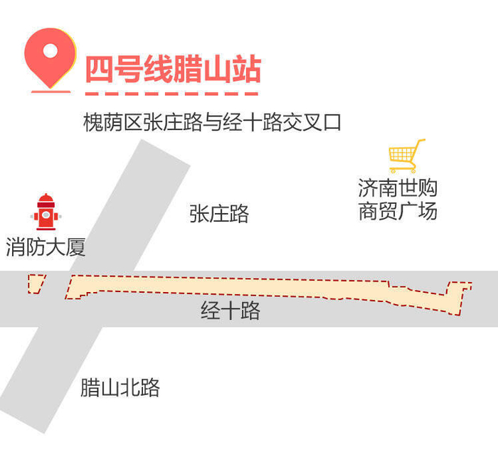 根据图示,腊山站用地面积约为1.28公顷,位于张庄路与经十路交叉口。腊山站是4号线与2号线的换乘站,周边有多处公交站点及地铁出入口,可实现公共交通的高效换乘。