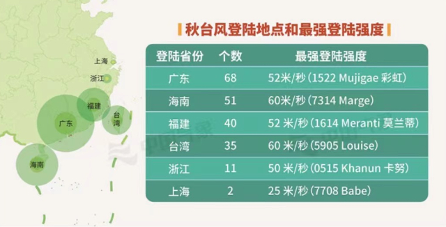 数据显示,72年间,登陆我国的秋台风,登陆点要比夏台风整体偏南,最常登陆地为广东,其次是海南和福建,登陆点最北到上海,登陆上海的两个台风登陆强度都不算强。