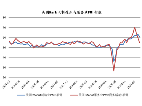鲍威尔的选择将可能加大美国经济滞胀风险。实际上,美国经济已经出现复苏乏力的迹象,从美国PMI、消费者信心以及耐用品订单走弱可窥一斑。8月美国Markit 服务业PMI 55.20%,前值59.90%,Markit 制造业PMI61.20%,前值63.40%;8月美国密歇根大学消费者信心指数70.30,时隔17个月后再次向下跌破80;7月美国剔除国防和飞机的制造业新订单同比14.9%,环比0.05%,均较上月较快下行。另外美国耐用品与非耐用品消费随着财政纾困计划到期而回落,服务业消费受德尔塔变异病毒影响而使复苏存在不确定性。