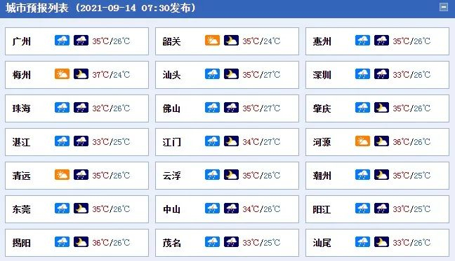 14日,广东大部多云,有雷阵雨,局部大雨或暴雨。最高气温:中北部市县35~37℃,南部市县32~34℃。