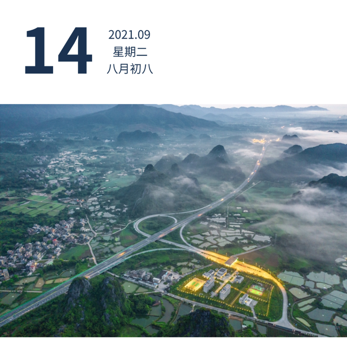9月11日,清晨中的阳春市凤来村,青山绿水间薄云缥缈,村庄旁边的高速公路汽车往来奔走。刘正亮 摄