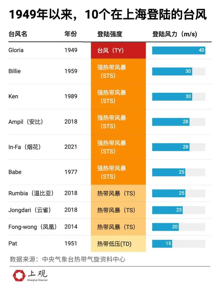 如果算上2021年的“烟花”,从1949年至今,只有10个台风在上海登陆过。总体来看,他们的威力都不是很强,能够以台风级别登陆的只有1949年的Gloria。