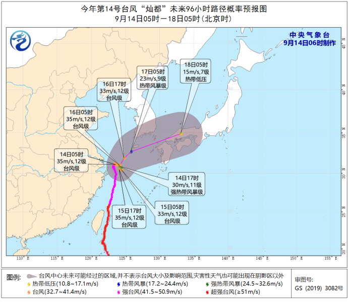 事实上的“灿都”14日凌晨由强台风级减弱为台风级,早晨7点钟其中心位于上海市偏东方约225公里的海面上,中心附近最大风力有12级(35米/秒)。