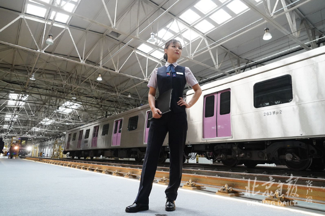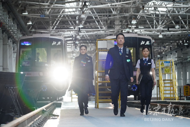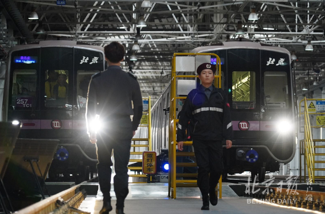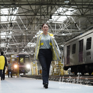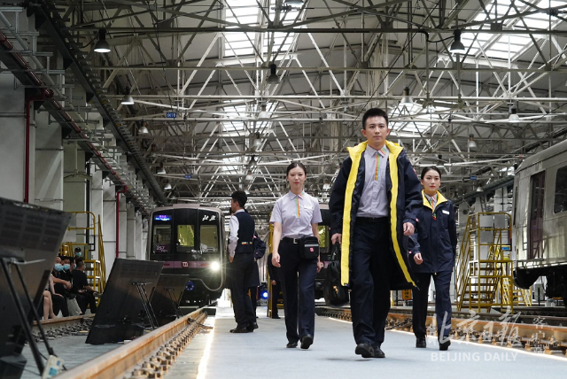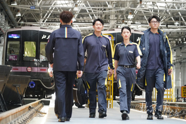 15日下午,在地铁14号线马泉营车辆段,一辆辆正在休息、保养的列车旁,几条停车股道中间别出心裁地划出一段走秀台,来自运营、工程、安保等多个岗位的地铁员工身穿新制服出场。