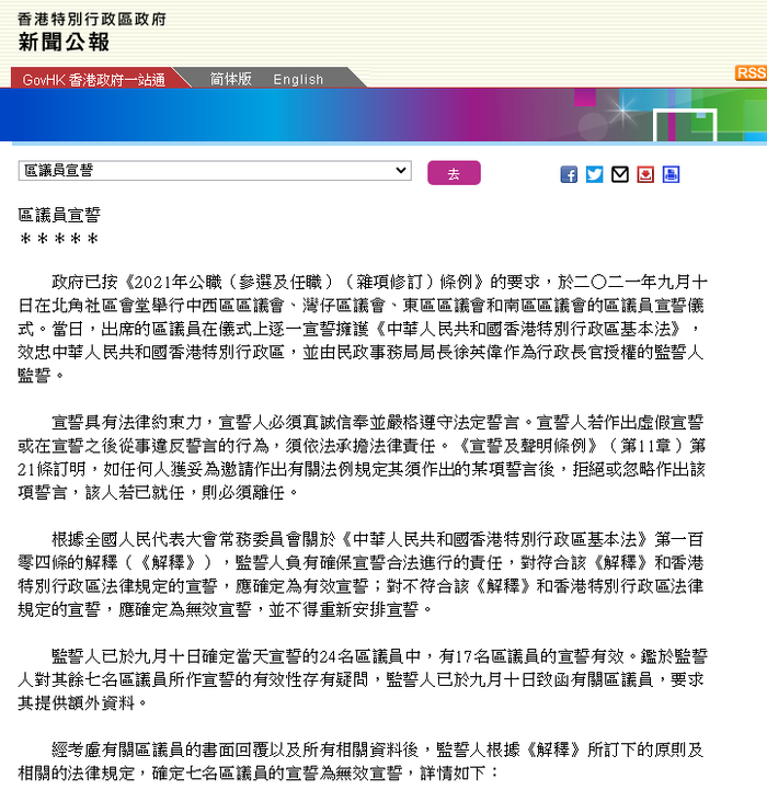 港府公报:香港区议员宣誓 此前宣誓有效性存疑的7名区议员被取消资格