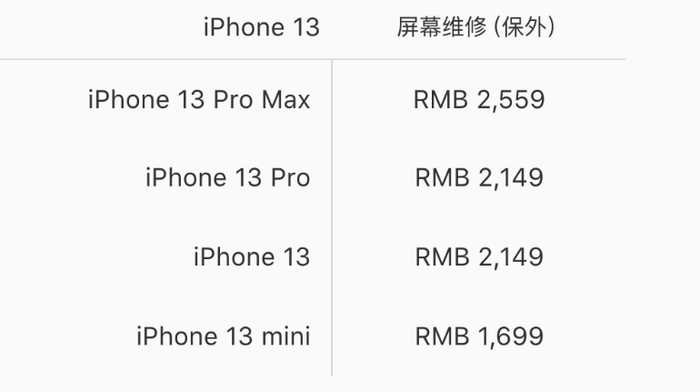 iPhone 13系列换屏价格公布,1699元起