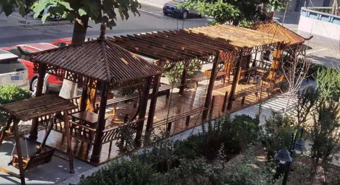 秋日午后,通州区中仓街道中上园社区5号院内树影婆娑。大门不远处,挑高的木质廊架搭配着同色系桌椅、栅栏、花箱,营造出一片颇具设计感的休闲空间。