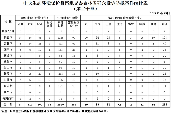 当日,上述信访案件已全部交办各地及省直相关部门。截至9月15日,吉林省已累计接收中央第一生态环境保护督察组交办信访案件2520件,包括重点案件264件。
