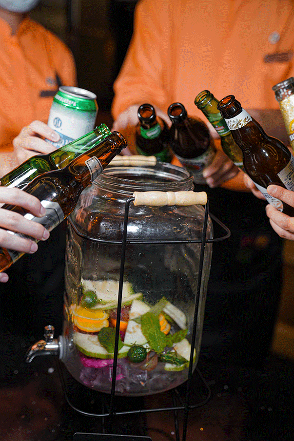 冰块铺底,加入各式新鲜时令水果,一次性倒入8款不同品牌酒水,制作出一个“啤酒炸弹”。