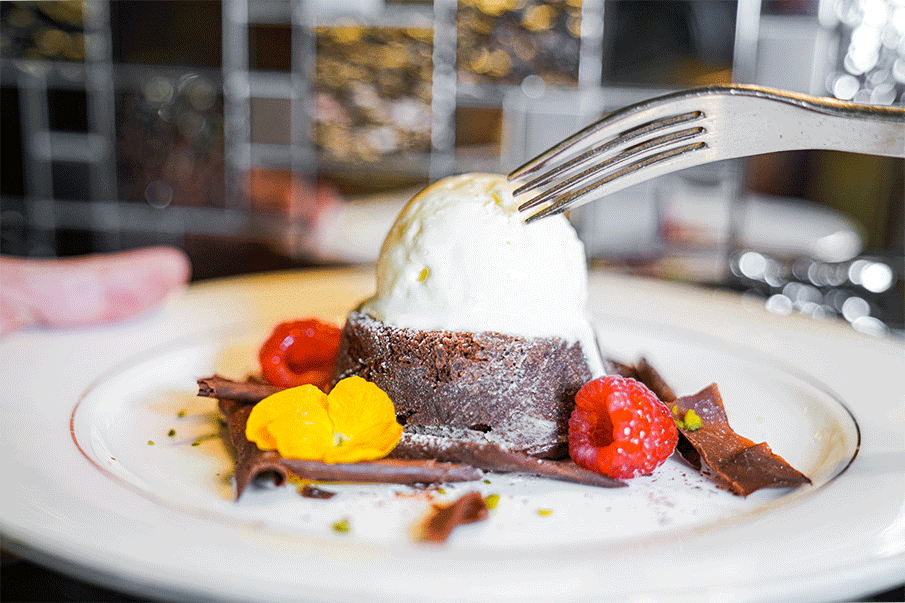 上桌之后一定要趁热吃,以免顶层的冰淇淋雪球被它的热情“吓”化了。从上往下挖一勺,内里夹心的巧克力浆缓缓流出。雪球的冰凉与巧克力流心的火热两极分化,好吃到哭惹!
