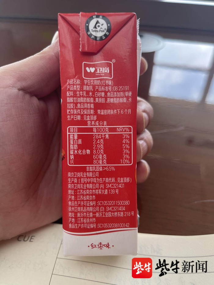 9月15日下午,网涉小学负责人向紫牛新闻记者说明了此事:“这种学生奶,是用来搭配学校午餐的,不需要另外花钱。”该责任人表示,学校一般是用水果搭配午餐,这种奶开学以来只喝过一次,并且只是为了给孩子们换口味、替换水果的。从该校提供的留存样品来看,之前喝过一次的同样是网帖所发卫岗学生饮用奶中的调制乳,而校方向记者提供的为红枣味。