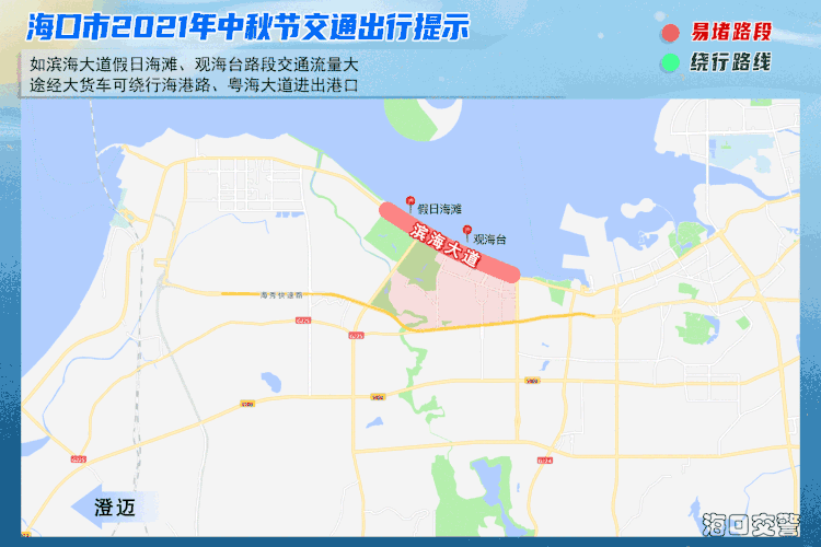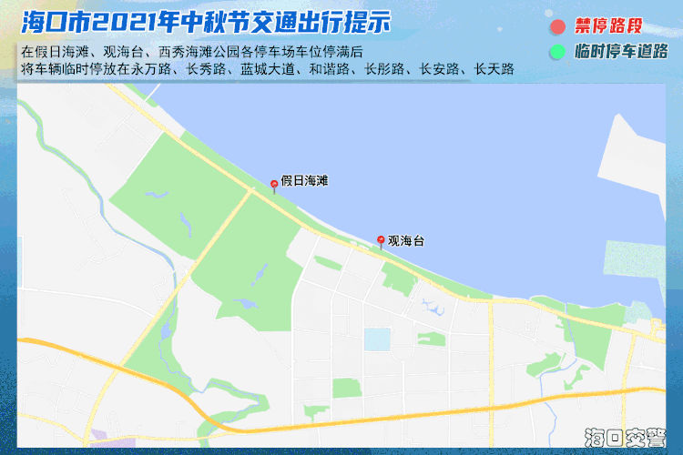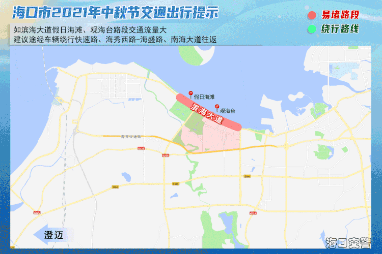 1、如滨海大道假日海滩、观海台路段交通流量大,建议途经车辆绕行快速路、海秀西路-海盛路、南海大道往返。