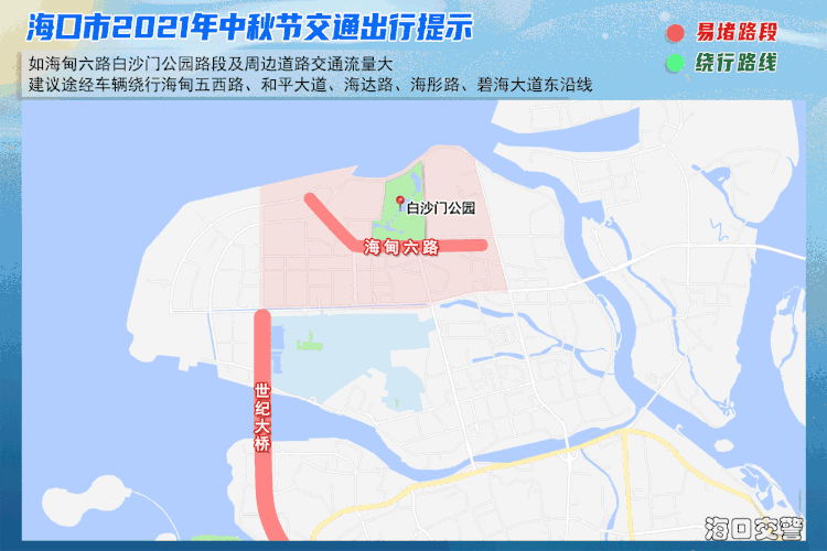 1、如海甸六路白沙门公园路段及周边道路交通流量大,建议途经车辆绕行和平大道、海达路、海彤路、碧海大道东沿线。