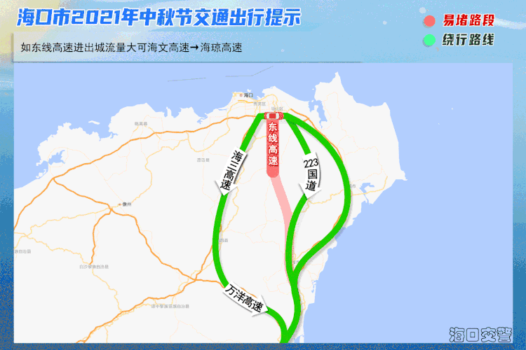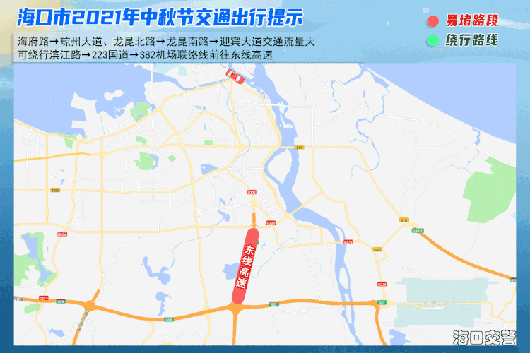 三、东线高速海口管段如东线高速进出城流量大,建议途经驾驶人视情况择道绕行: