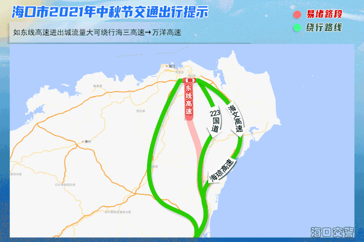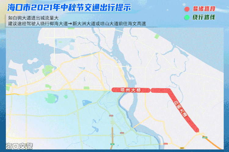 (二)如琼州大桥进出城流量大,建议途经驾驶人择道进出城: