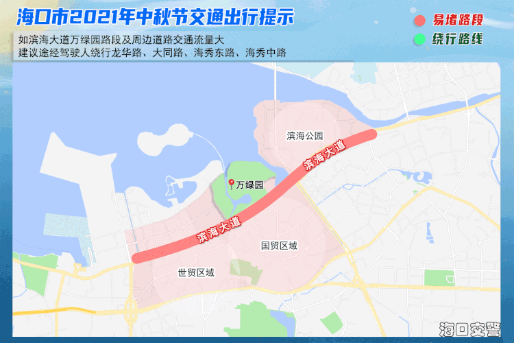1、如滨海大道万绿园路段及周边道路(滨海大道滨海公园路段、国贸区域、世贸区域)交通流量大,建议途经驾驶人绕行龙华路、大同路、海秀东路、海秀中路。