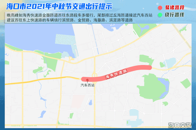 四、海秀快速路易拥堵路段晚高峰,如海秀快速路金垦匝道西往东路段车多缓行,车辆排过丘海匝道接近汽车西站,建议西往东上快速路的车辆绕行滨贸路、金贸路、海垦路、滨涯路等道路,避开快速路拥堵路段。