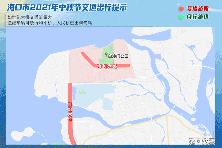 2、如世纪大桥交通流量大,途经车辆可绕行和平桥、人民桥进出海甸岛。