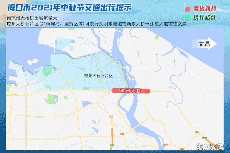 1、琼州大桥北片区(如海甸岛、国贸区域)可绕行文明东隧道或新东大桥→江东大道前往文昌。
