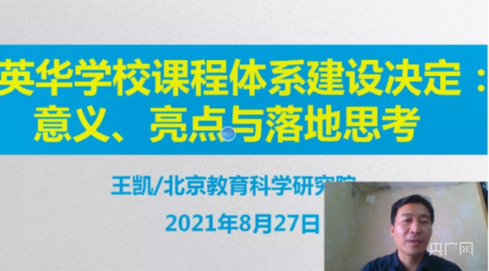 北京教育科学院王凯博士通过网络直播的形式为全体英华人带来了《英华学校课程体系建设决定:意义、亮点与落地思考》的精彩讲座。他表示,《英华学校课程体系建设决定》文件的下发,是英华学校课程体系建设的重要里程碑,标志着英华课程体系建设之路的进一步的明晰化,是学校课程改革的共识性力量。英华学校课程体系建设决定是英华教育改革深化推进的必需之策,是教育高质量发展的必然要求,也是英华未来发展之路的现实回应。