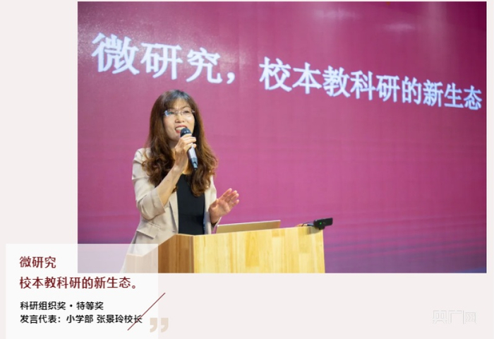 小学部张景玲校长表示:小学部校本教科研经历“聚焦高效课堂”“教师教育教学能力全面提升”“问题导向的微研究”三个阶段,以问题为导向的微研究促进了教师成长,引导教师向智慧型教师转化;使得学生的深度学习在课堂变革中真正发生,帮助学生在多元课程中实现自我成长;同时,微研究还提升了教育教学品质,推动了学校教育的内涵化发展。