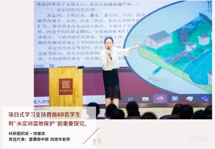 普通高中部刘培华老师从发现问题、制定计划、活动探究、作品创作、成果交流、评价反思六个步骤,通过大量实例为大家展示了“永定河故道湿地保护”项目式探究课题的实施过程。她表示:项目式学习就是边做边学,在一个个难题解决中碰撞出不一样的花火,发现每个人的闪光点,通过关注与欣赏,拉近了学生之间、教师之间、学生与教师间的距离。